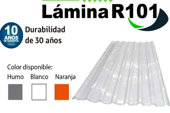 Lámina de policarbonato R101, durabilidad de hasta 30 años, resistente a impactos y rayos UV. Disponible en colores humo, blanco y naranja, ideal para techos y cubiertas en proyectos de construcción.